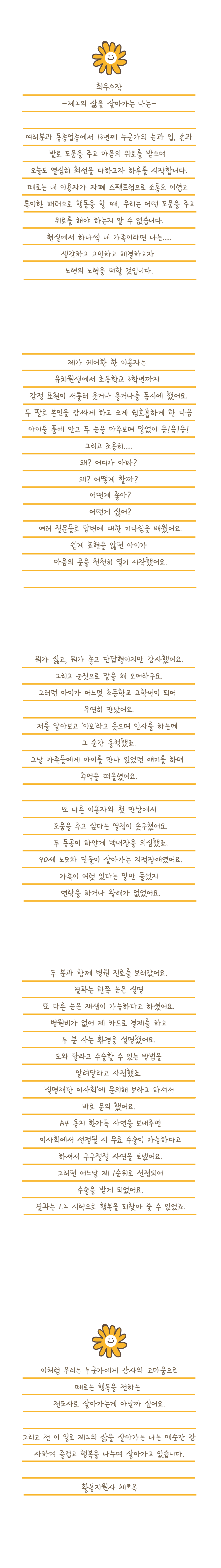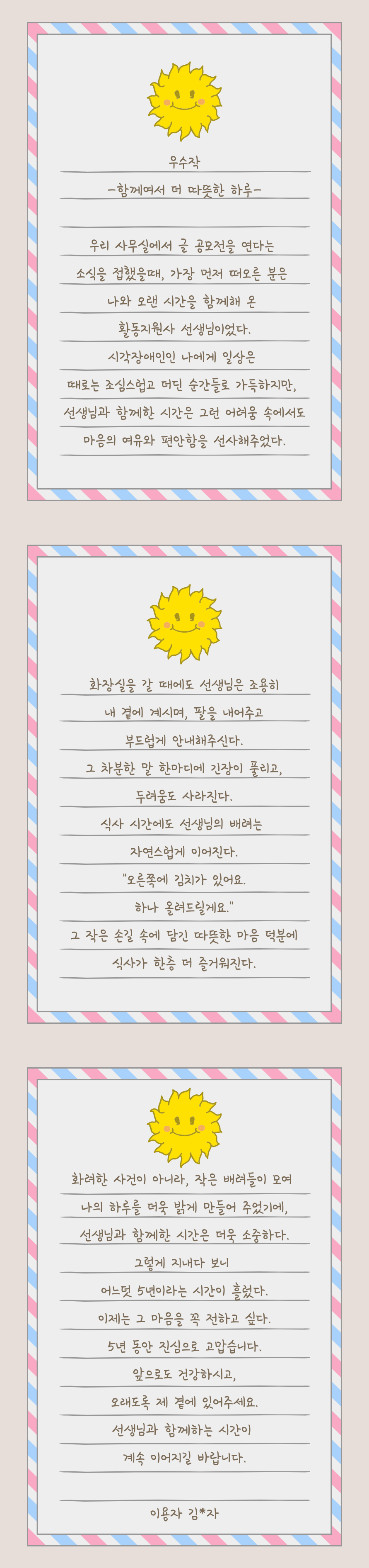 | 공지 | 법인 | [모집공고] "시각장애인도 색깔로 나를 표현할 수 있어요" - 컬러테라피 상담 프로그램 | 2025-07-22 | 관리자 | 19848 |